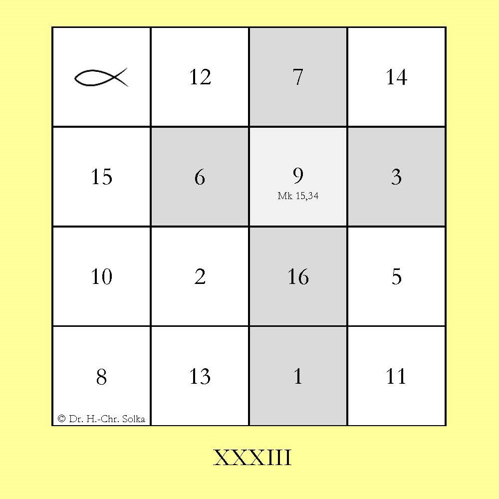 Normally, a magic square means correlating whole numbers into the grid: for a 4×4 grid, the numbers are from 1 to 16. Their sum is 136. The magic sum cannot freely be chosen and depends on the sum of the numbers used. Those, the magic sum is 136/4 = 34. However, the Sagrada Família magic square doesn't meet a sum of 34. On the one hand, it doesn't have all the numbers from 1 to 16 (it is missing the 12 and 16), and some numbers (14 and 10) are repeated. If you add up the numbers, whether vertically, horizontally, or diagonally, they always add up to 33, intended to remind us of the age of Jesus Christ at his crucifixion. Solka's Diptych Passion, Death, and Resurrection of Jesus Christ Inspired by the famous Sagrada Família magic square, German engineer Dr. Hans-Christian Solka created his diptych, The Passion, Death, and Resurrection of Jesus Christ, in 2017. The diptych consists of the magic squares The Passion and Death of Jesus Christ and The Resurrection of Jesus Christ. By combining Christian symbolism and mathematics, Solka created them with the symbolic sum of 33 without using duplicate numbers. That seemed impossible before. Not only do the sums of each row, column, and diagonal add up to 33, the sacred number 33, the age of Jesus Christ at the crucifixion, but also the sum of the numbers of the cross. In the center of the cross is the number 9, commemorating the hour of Jesus Christ's death. The Greek word for fish (Ichthys) is an acronym for the short confession of faith: ΙΗΣΟΥΣ - "Jesus;" ΧΡΙΣΤΟΣ - "the anointed one;" ΘΕΟΥ - "God's;" ΥΙΟΣ - "Son;" ΣΩΤΗΡ - "Saviour/Redeemer." The missing number four points to the four canonical gospels of Matthew, Mark, Luke, and John, in which the earthly life of Jesus culminates in his death and resurrection. I - The Passion and Death of Jesus Christ Mark 15,34; And at the ninth hour, Jesus cried with a loud voice, "Eloi, Eloi, lema sabachthani?" which means, "My God, my God, why have you forsaken me?"
